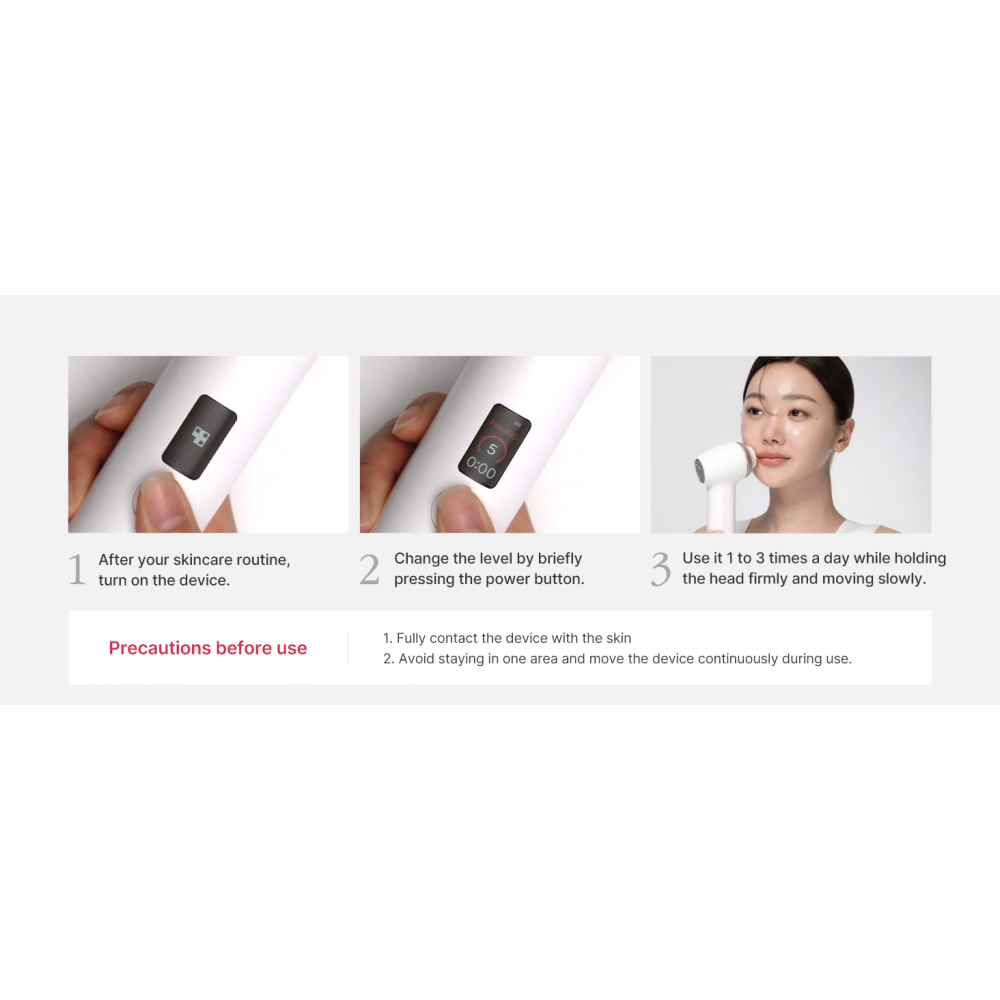 - Stosować 1-3 razy dziennie. Urządzenie aktywuje się tylko wtedy, gdy wszystkie sześć końcówek jest w pełnym kontakcie ze skórą.