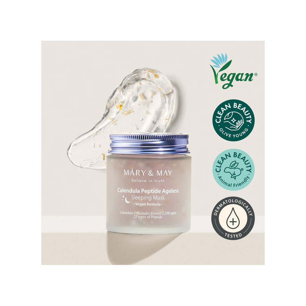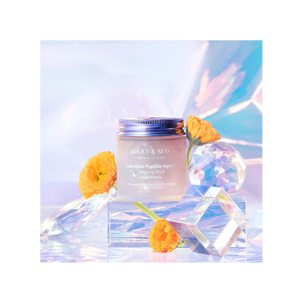 Mary & May Calendula Peptide Ageless Sleeping Mask - maseczka na noc z płatkami nagietka i peptydami. Łagodzi podrażnienia, wspomaga regenerację skóry i odżywia podczas snu. Testowana dermatologicznie, wolna od 18 szkodliwych składników, odpowiednia dla wszystkich rodzajów skóry.