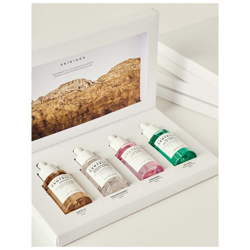 Limitowany zestaw do pielęgnacji skóry od Skin1004 zawierający cztery ampułki na bazie Centelli, które łagodzą, rozjaśniają, leczą trądzik i zwężają pory - odpowiednie dla wszystkich rodzajów skóry, w tym wrażliwej i trądzikowej.