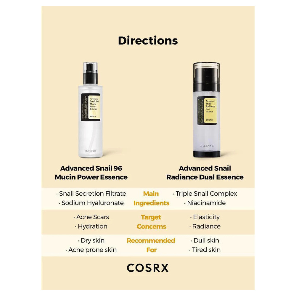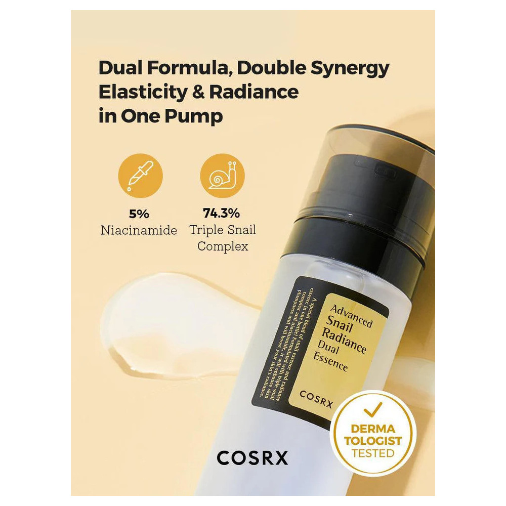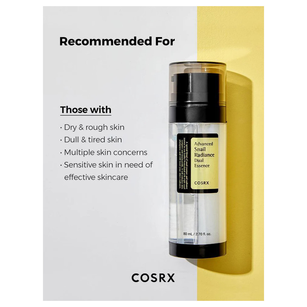 COSRX Advanced Snail Radiance Dual Essence to dwukomorowa kuracja rozjaśniająca i nawilżająca z mucyną ślimaka i wzmacniaczami blasku, która wypełnia, wyrównuje koloryt i przywraca blask w jednej pompce.