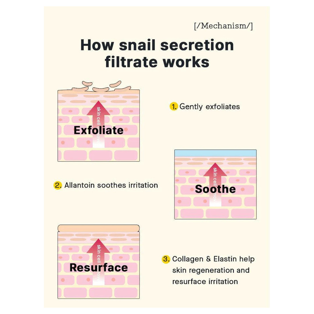 Filtrat wydzieliny ślimaka, glikol butylenowy, niacynamid, 1,2-heksanodiol, betaina, pantenol, woda, gliceryna, olej z nasion Limnanthes Alba (Meadowfoam), olej z nasion Helianthus Annuus (Sunflower), alantoina, Carbomer, Macadamia Ternifolia Seed Oil, Sodium Polyacrylate, Sodium Hyaluronate, Inulin Lauryl Carbamate, Arginine, Argania Spinosa Kernel Oil, Xanthan Gum, Sodium Surfactin, Ethylhexylglycerin, Glutathione.