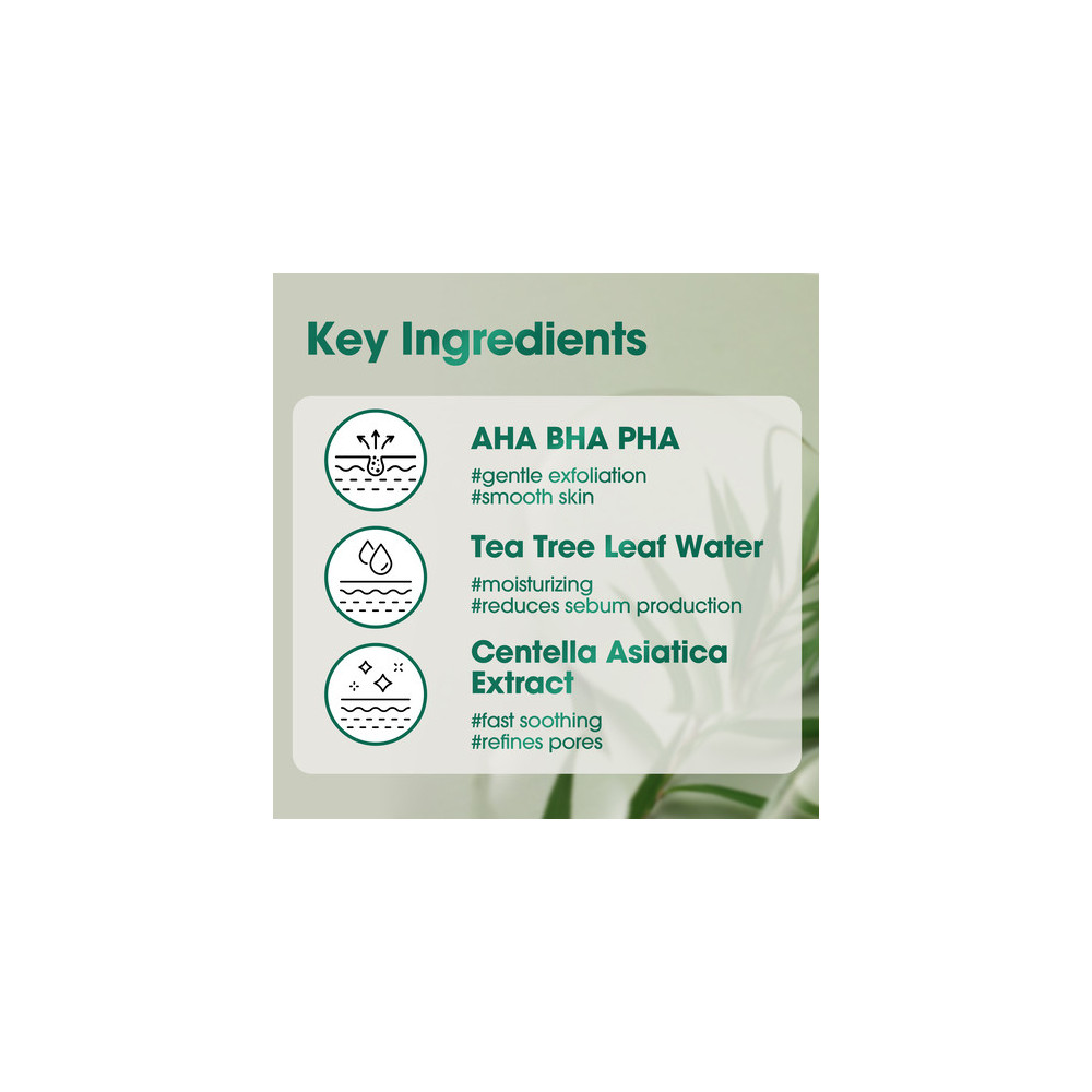 Serum do codziennej pielęgnacji skóry z niedoskonałościami, które łączy potrójne kwasy (AHA-BHA-PHA) z 10 000 ppm wody z liści drzewa herbacianego i 14,5% Centella asiatica. Pomaga odblokować pory, wygładzić szorstką teksturę i złagodzić widoczne zaczerwienienia, jednocześnie utrzymując pH przyjazne dla skóry do codziennego stosowania.