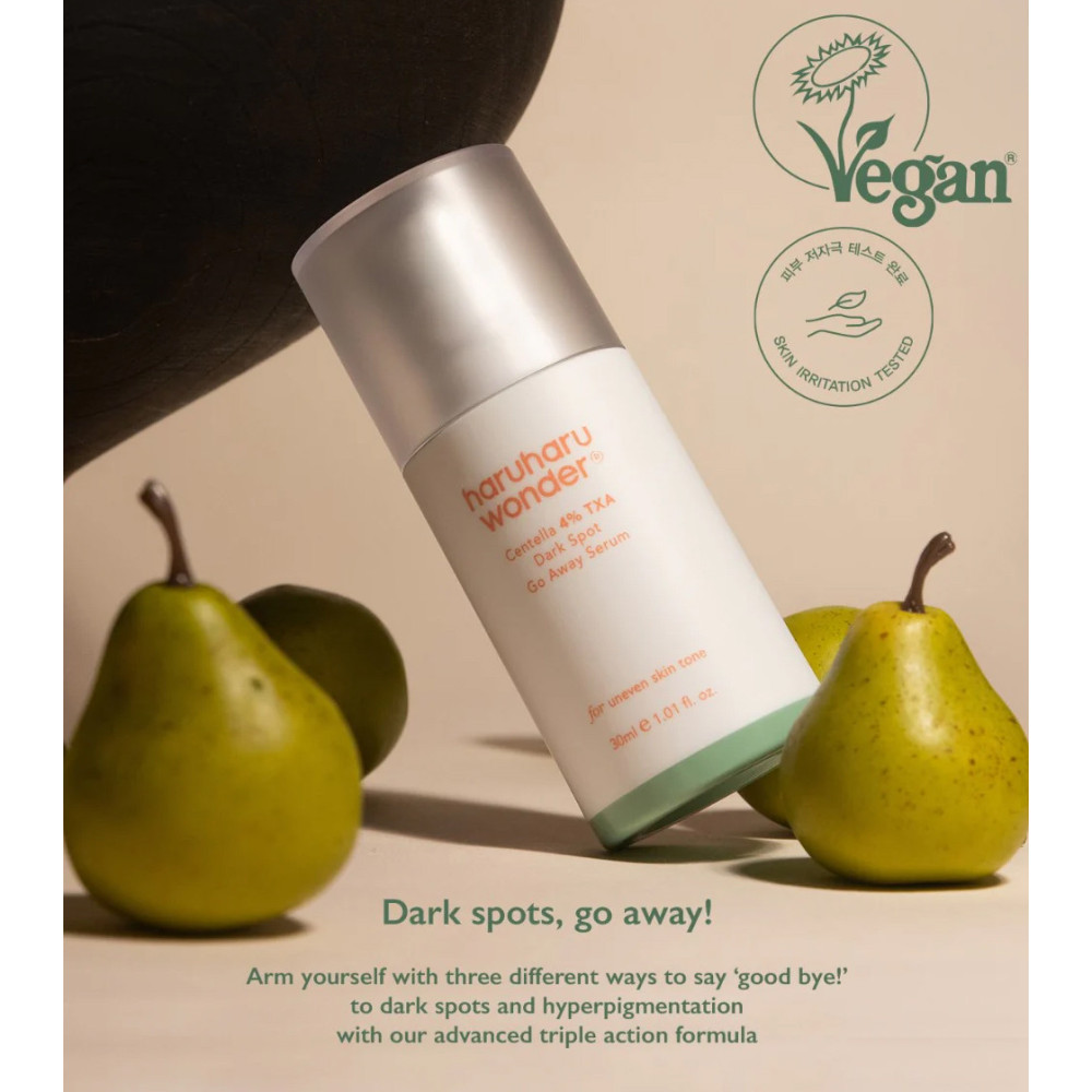 Haruharu Wonder Centella 4% TXA Dark Spot Go Away Serum to lekki, wodnisty krem-serum opracowany w celu widocznej redukcji ciemnych plam i zmarszczek. Dzięki zawartości 4% kwasu traneksamowego, niacynamidu i witaminy C reguluje produkcję melaniny, rozjaśnia koloryt skóry i zapobiega powstawaniu nowych przebarwień.